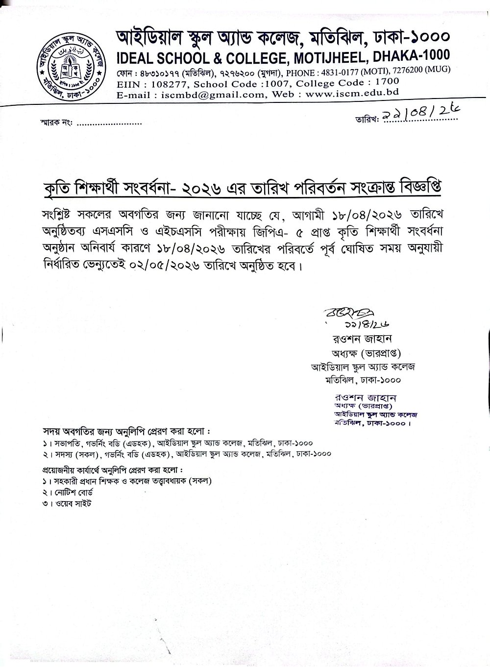 কৃতি শিক্ষার্থী সংবর্ধনা- ২০২৬ এর তারিখ পরিবর্তন সংক্রান্ত বিজ্ঞপ্তি